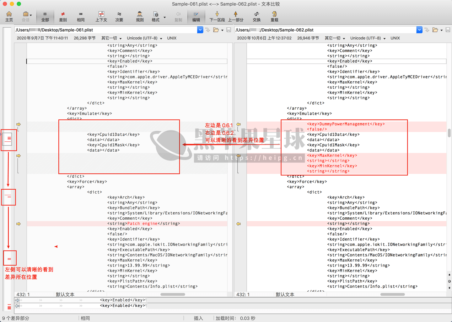 那么先说说第一种思路的实践方式,首先打开两个版本的 sample.plist,可以清晰的看到两个版本不同的地方: