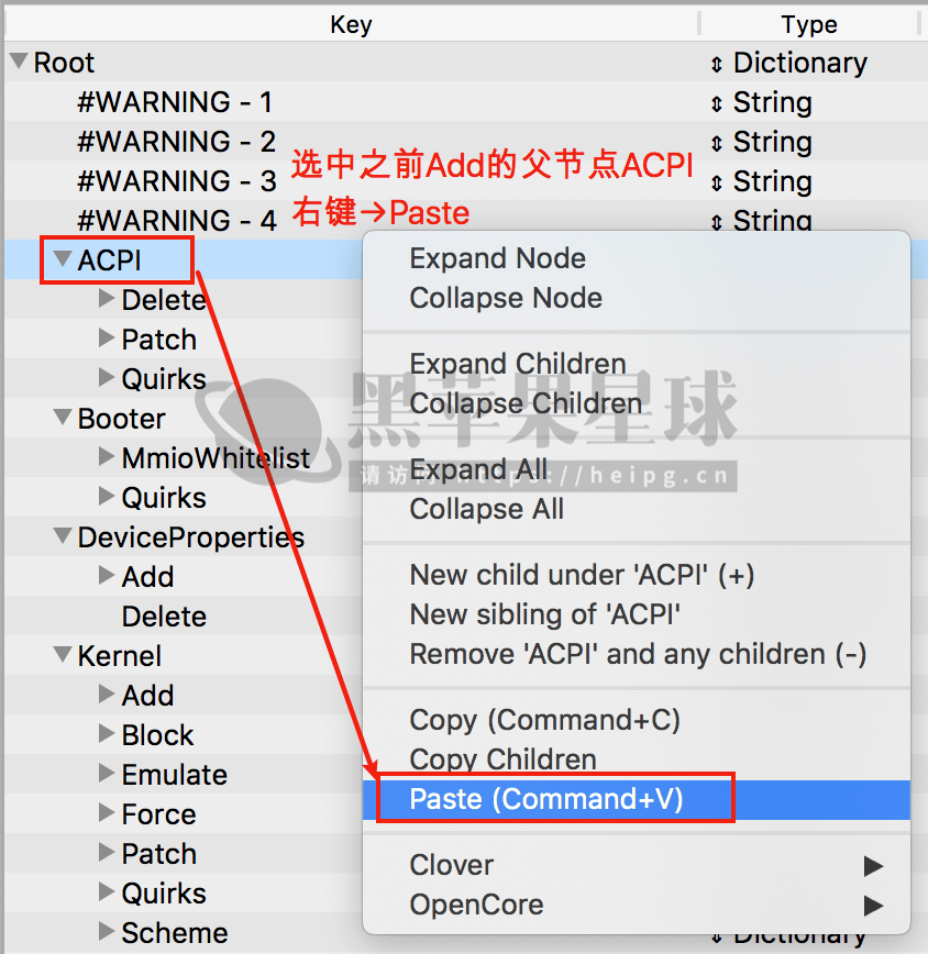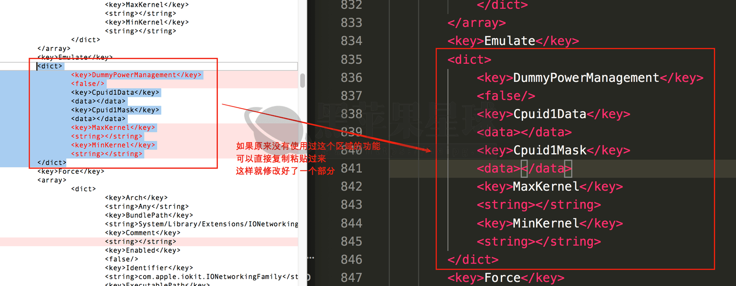 上图中,红色代表需要删除,蓝色代表可以批量复制粘贴,绿色是一般机型用不到的,但是如果你的旧版 config.plist 里有就必须复制过去;其余未提及的部分请逐个检查 + 复刻值(例如 Quirks 部分)。至于如何批量复制粘贴?见下图: