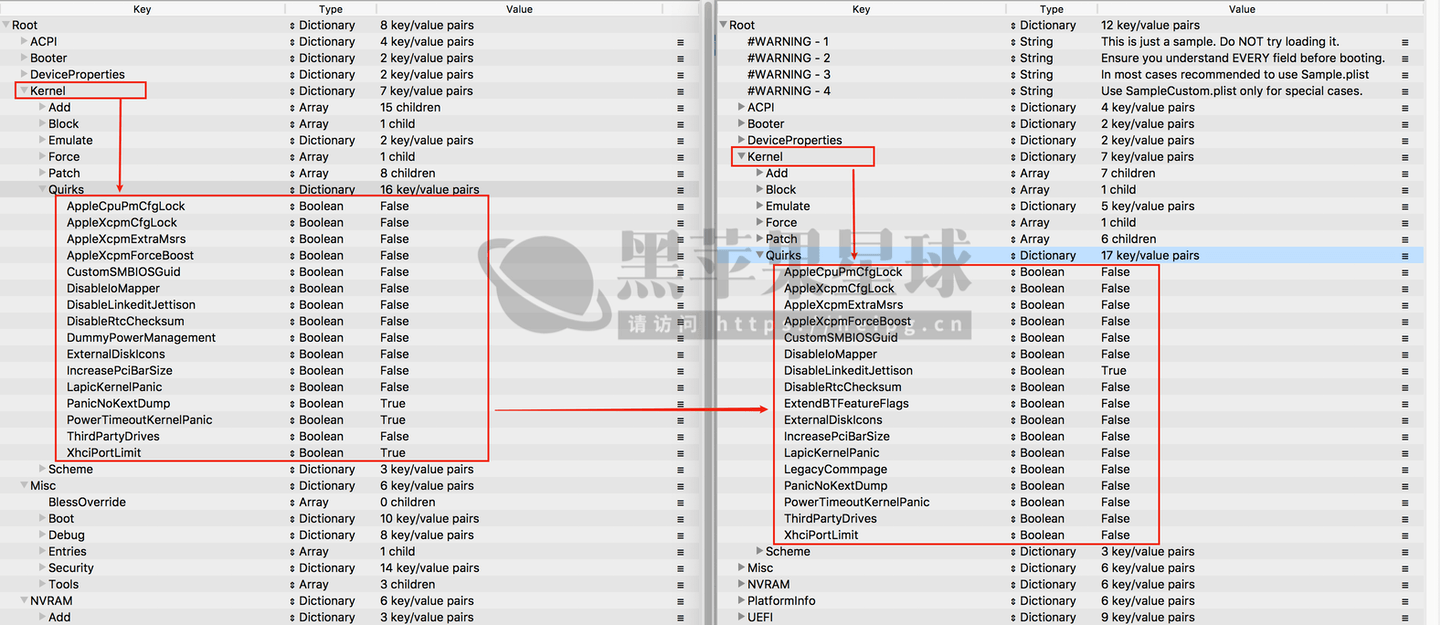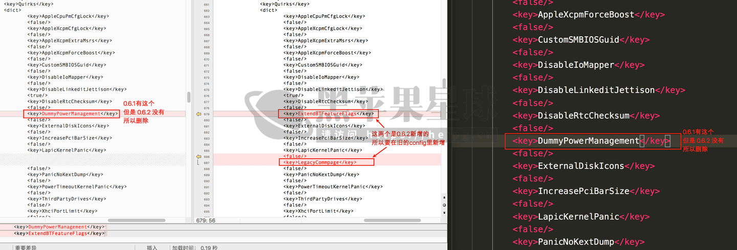 其二,就其它设置方面,例如 Kernel → Quirks,照着你的旧版的文件抄设置即可。注意 Kernel 这个部分其实是最近几个版本变化比较多的地方,例如 0.6.1 升级到 0.6.2 就把 DummyPowerManagement 挪到了别的地方,这种情况,如果你用不到这个 Quirk 还好,需要用的话,那就需要去看官方的说明文档啦。