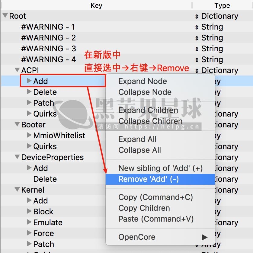 以 ACPI 区域下的 SSDT 表为例,打开新版文件,找到 ACPI → Add,右键删除(Remove)整个 Add 区。