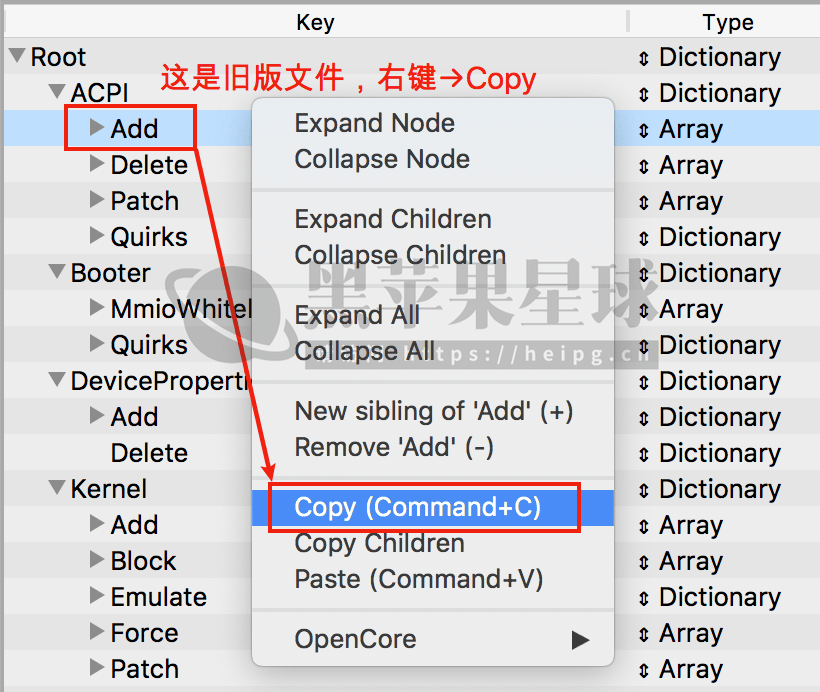 打开旧版文件,找到 ACPI → Add,右键复制(Copy)整个 Add 区。