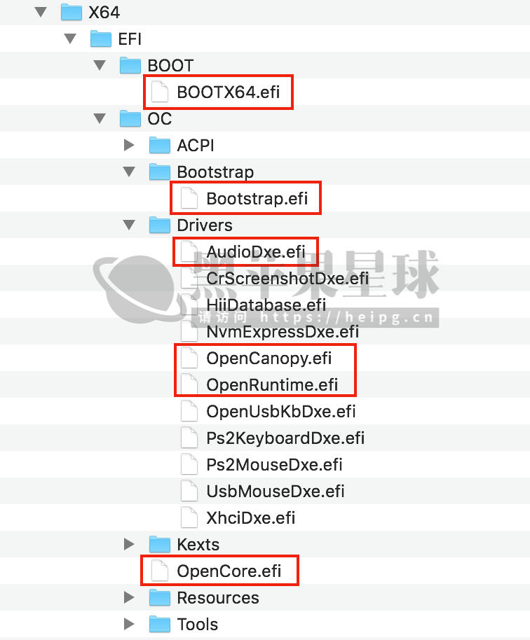 - /EFI/BOOT/BOOTx64.efi:OpenCore 的引导文件,必须替换