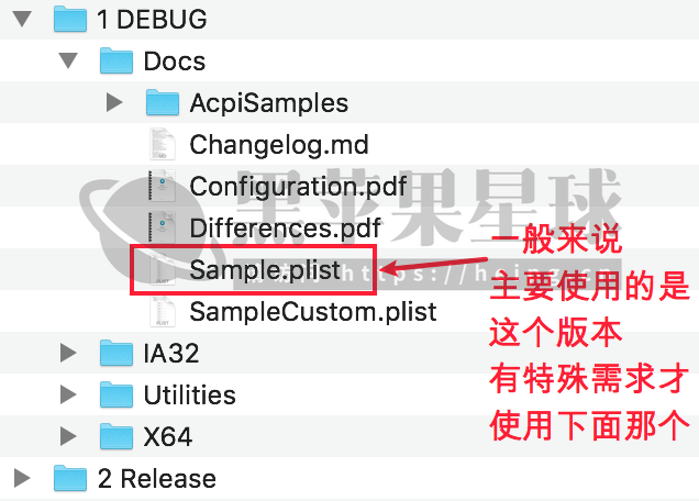 复刻法具体来说,需要根据你准备使用的工具来划分,一种是图形化配置工具,例如 OpenCore Configurator;另一种是传统的 Plist 编辑工具,例如 ProperTree。当每个新版本 OpenCore 和 Clover 发布时,开发团队一般都会提供一个 Sample.plist,OpenCore 一般位于 /doc/ 文件夹内;Clover 一般位于 /EFI/Clover/,这个文件就是我们 EFI 文件夹内的 config.plist 的原型,把它拷贝到你的 efi 文件夹中即可进行修改操作,下面将分别进行操作演示。
