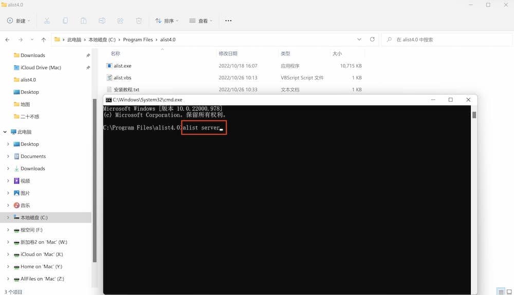 2.在alist文件夹地址栏输入cmd回车,弹出窗口输入alist server回车