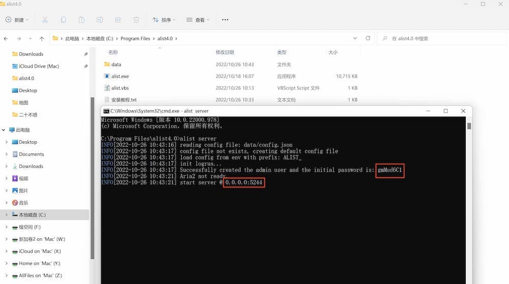 3.出现0.0.0.0:5244地址表现成功,记住password is:后面的密码