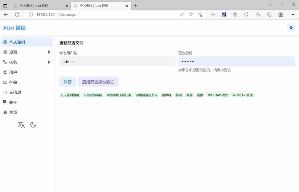 4.在浏览器输入成功地址(或者127.0.0.1:5244和localhost:5244)进入管理界面