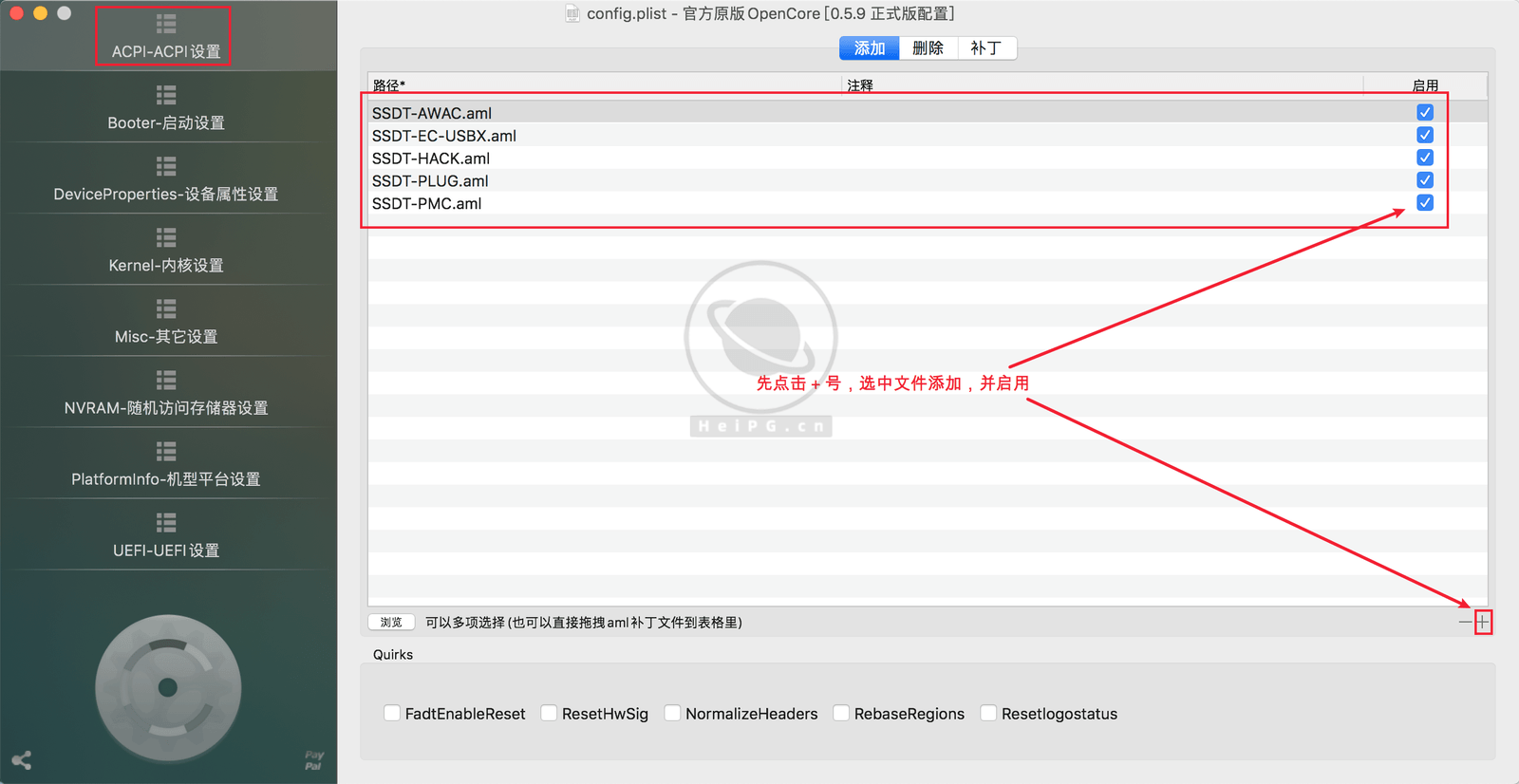 最后,把以上你需要的 SSDT 文件放到 /EFI/OC/ACPI/ 目录,并在 config.plist 文件中启用:(下图使用的软件是 OpenCore Configurator,点击“浏览”添加指定文件)