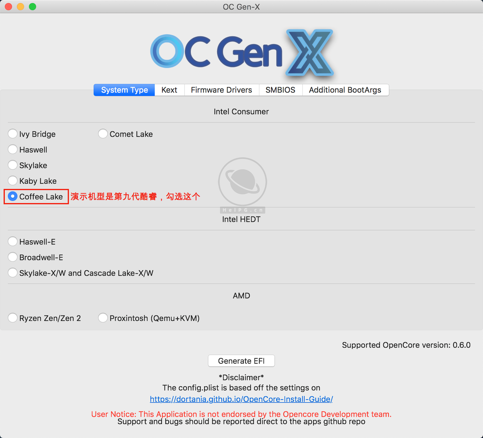 接下来,我们运行 OC.Gen-X,根据自己的硬件平台勾选对应的设置,演示机型配置如下表: