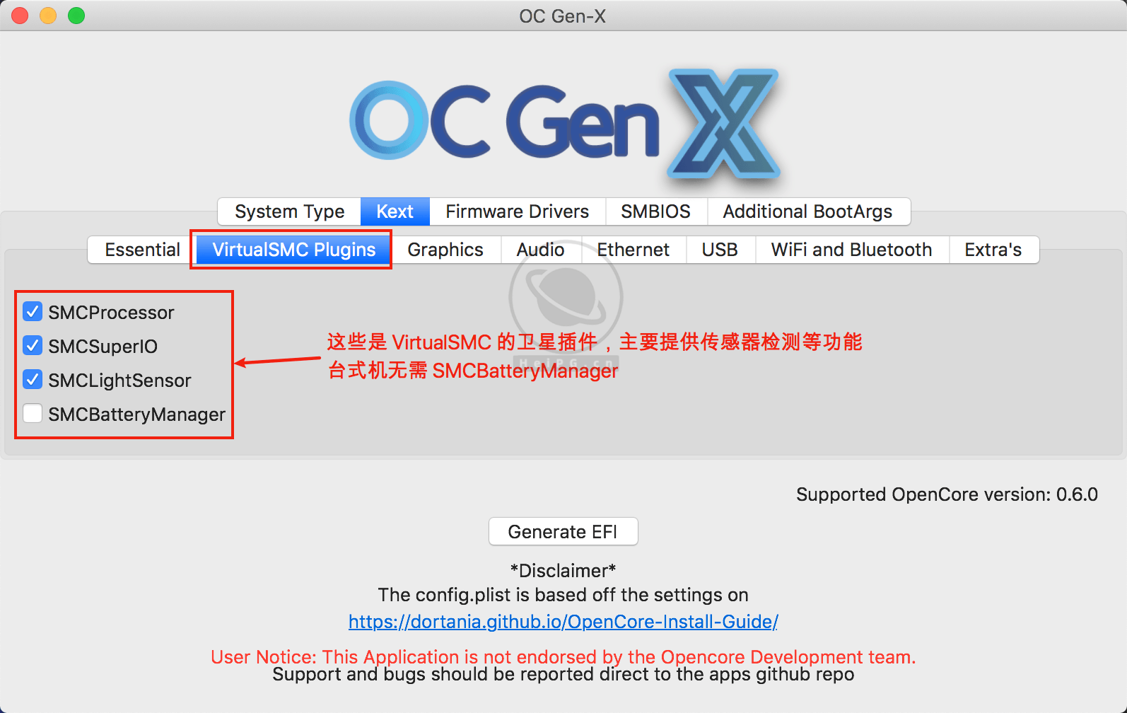 OC.Gen-X 是一款主要由 Pavo-IM Pavo 开发的小工具,用于一键生成适用于 OpenCore 的 EFI 引导文件夹(各项设置基于 Dortania 的 OpenCore 安装指南)。不过该 app 需要 macOS 环境才能运行,没有的用户可以先使用虚拟机安装 macOS(macOS 10.15 即可),配置好 EFI 文件夹后可以通过刻录镜像的方式安装 macOS,基础安装教程可参考此链接。